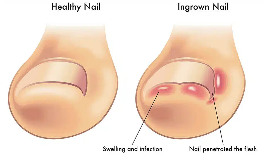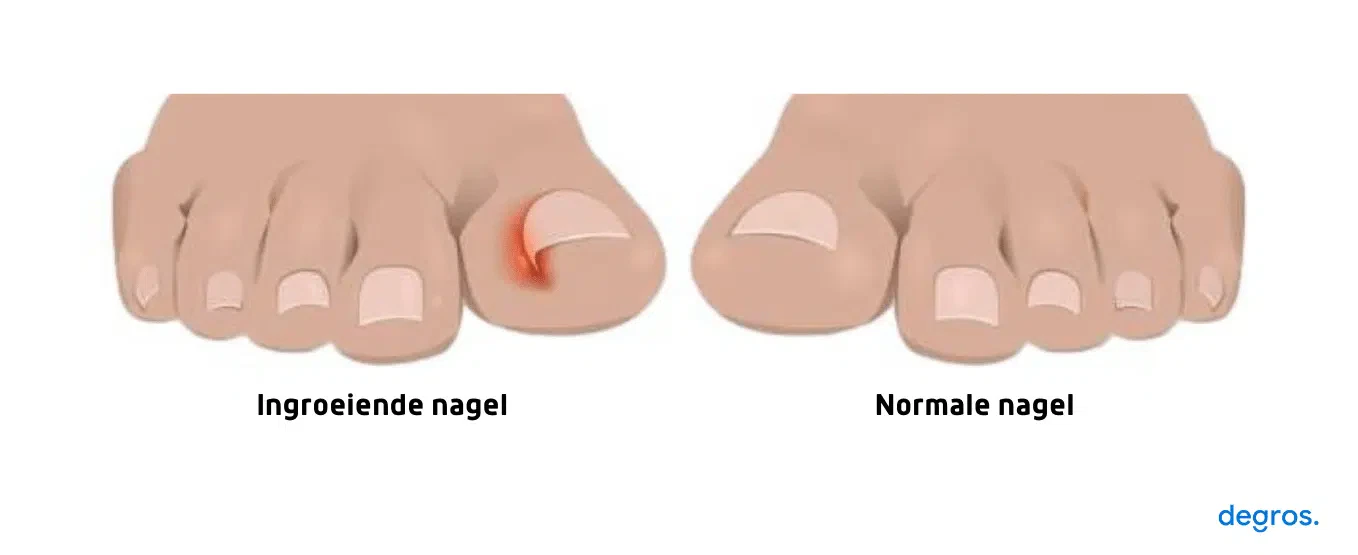 Een nagel waarbij de rand of de punt in de nagelplooi drukt en pijnklachten geeft vormt het begin van een ingroeiende nagel. Dit kan veel pijn en een ontsteking veroorzaken. Meestal treedt het probleem op bij de grote teen. De meeste oorzaken zijn de volgende: Verkeerde schoenen (te smal of te klein); Verkeerd knippen (te kort en/of ronde hoekjes); Afwijkende vorm van de nagel, bijvoorbeeld te hoge curve (bol);